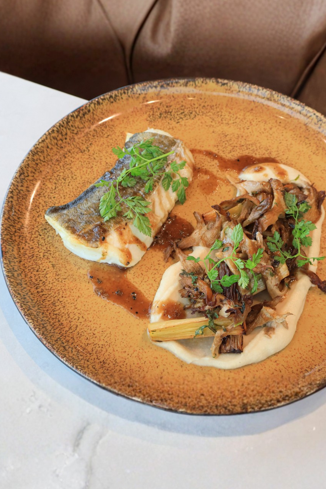 DOS DE CABILLAUD SUR PEAU, PÊCHÉ par notre navire, POIREAUX BRÛLÉS, PLEUROTES, JUS DE VIANDE à la truffe