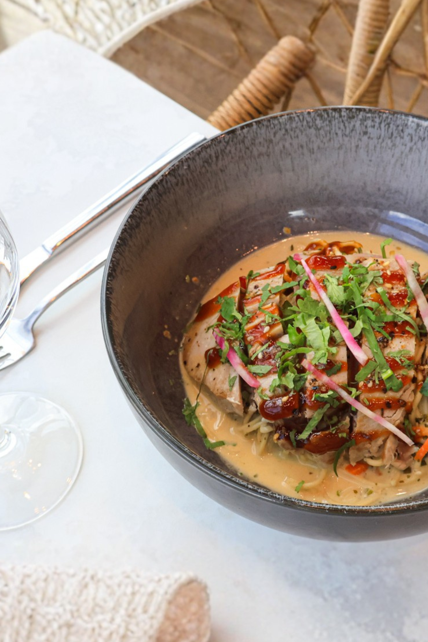 MI-CUIT DE THON, CARAMEL DE SOJA & GOMASIO, NOUILLES CHINOISES, NAGE COCO, GINGEMBRE & CITRONNELLE, CORIANDRE FRAÎCHE